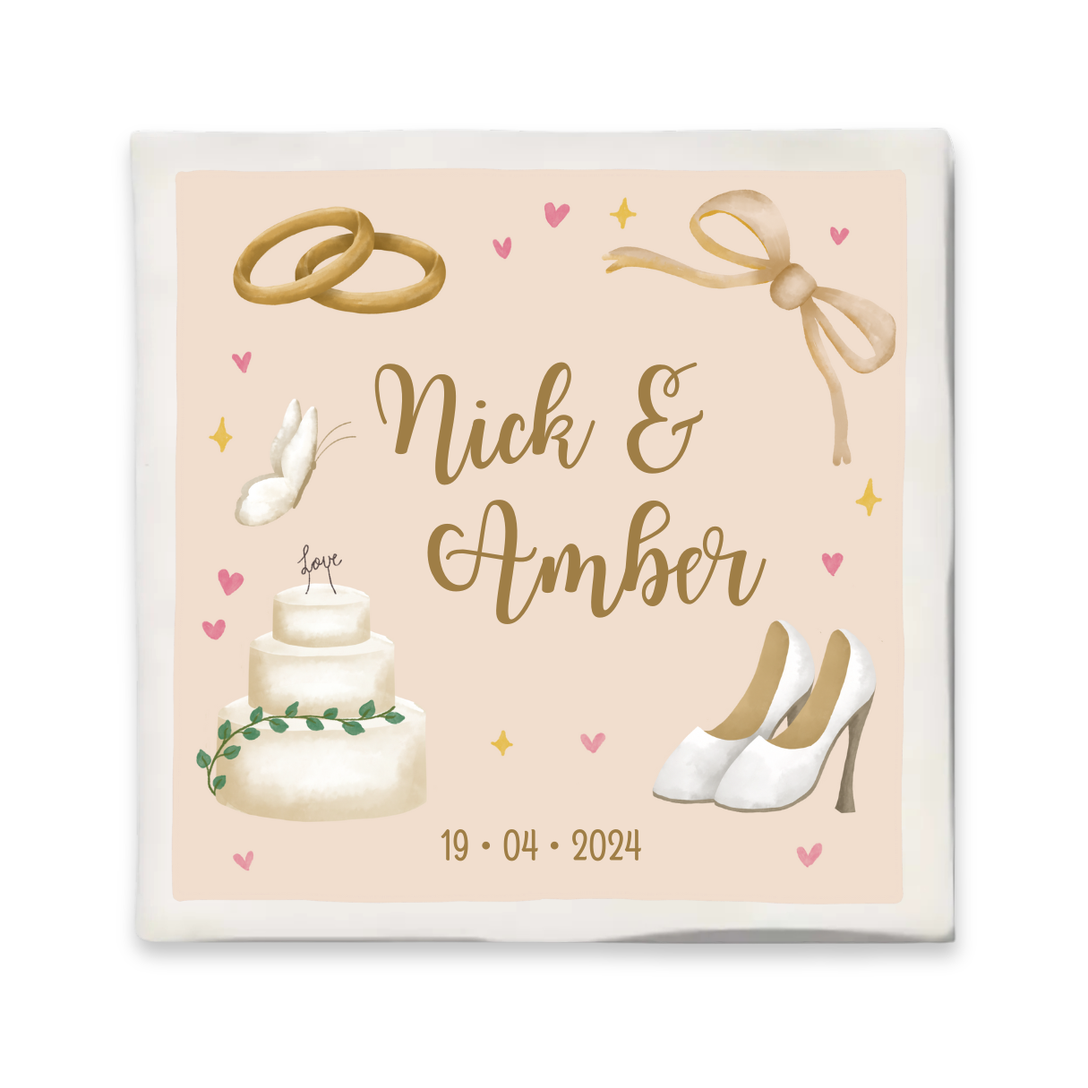 Leg jullie liefde vast op dit romantische huwelijkstegeltje, gepersonaliseerd met jullie namen en trouwdatum. Omringd door symbolen van de grote dag – trouwringen, bruidstaart, pumps, strik en een vlinder – is dit een liefdevol aandenken aan een bijzondere mijlpaal. Perfect als cadeau voor een bruiloft, verloving of jubileum, of als blijvende herinnering aan jullie mooiste dag.