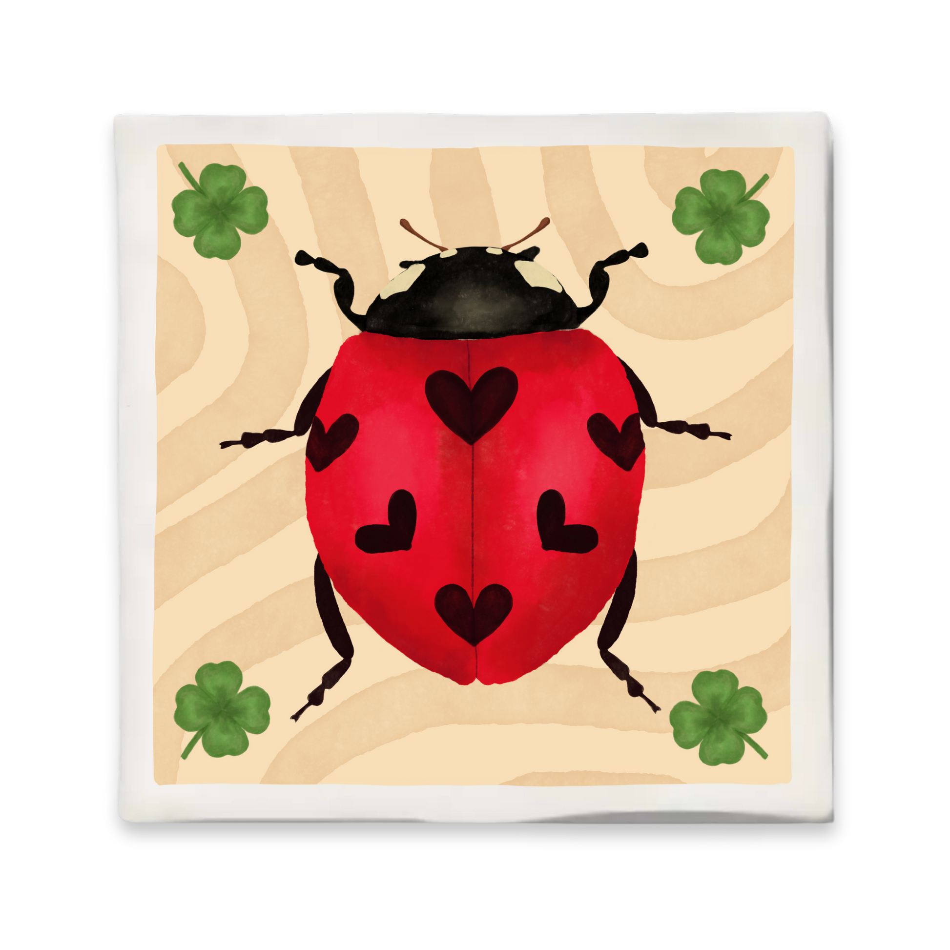 Dit decoratieve tegeltje met een lieveheersbeestje brengt geluk in huis! Het ontwerp toont een speels rood lieveheersbeestje met hartvormige stippen, omringd door klavertjesvier op een warme, organische achtergrond. Een perfect detail voor natuurliefhebbers, geluksbrengers of als charmante decoratie in je interieur.