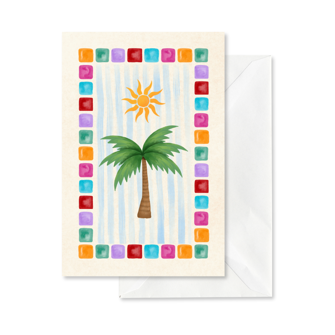 Een tropische verrassing in de brievenbus! Deze kleurrijke wenskaart met palmboom, stralende zon en vrolijke rand van bonte tegeltjes brengt direct het zomergevoel tot leven. Of je nu iemand een fijne vakantie wenst, een zonnige groet wilt sturen of gewoon wat warmte wilt delen. Deze kaart doet het allemaal.